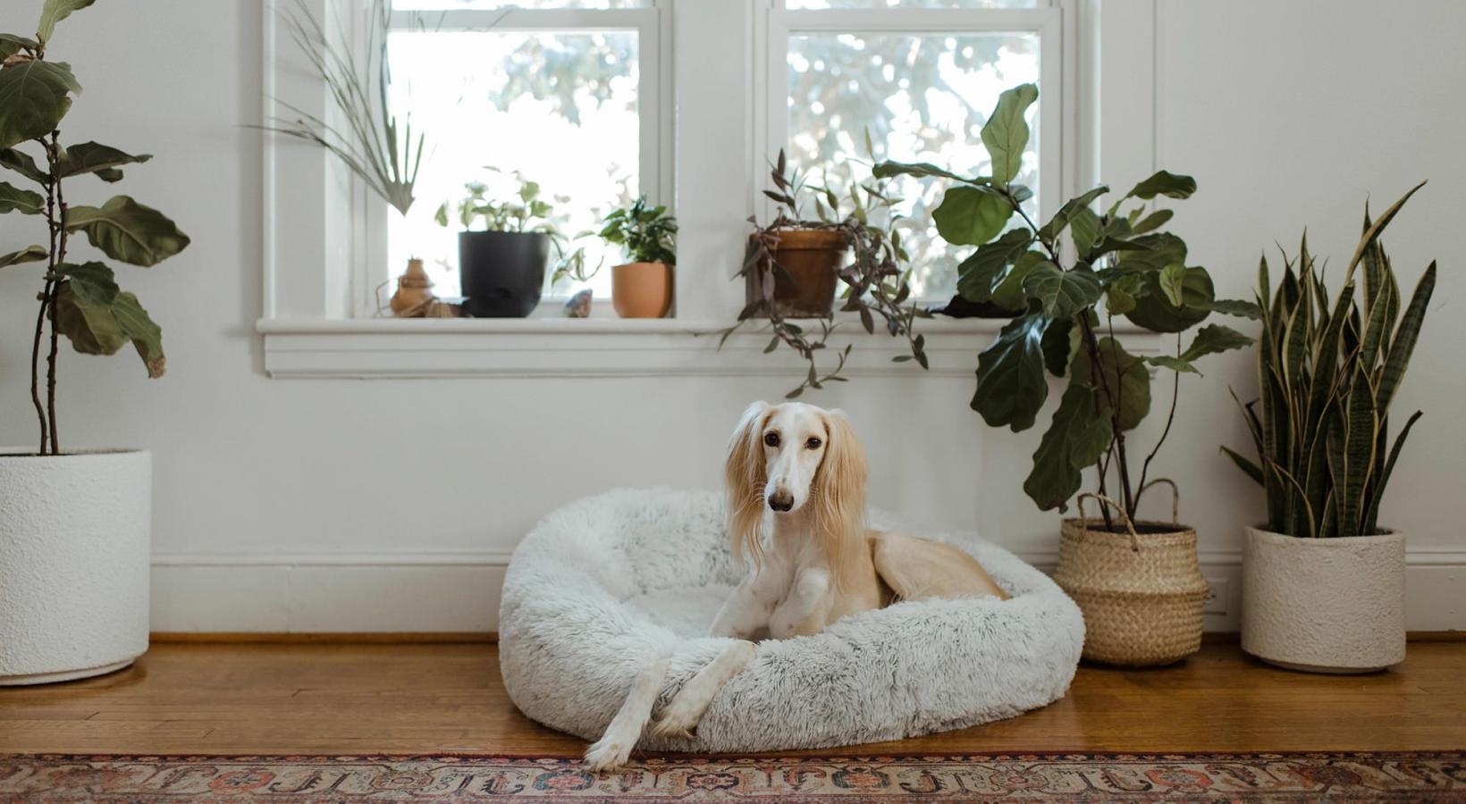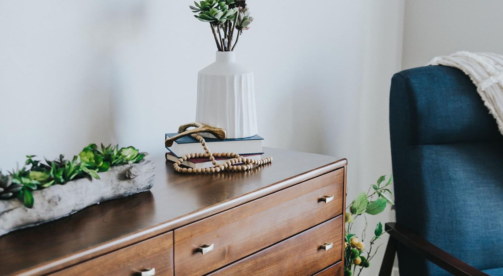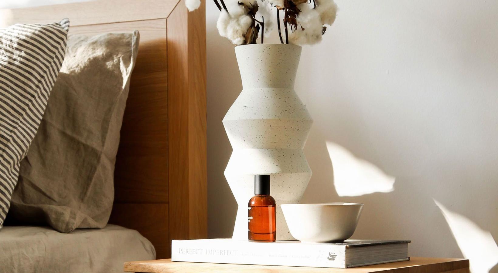• swath of sunlight shines across a well made bed and bedside table with a vase of cotton plants